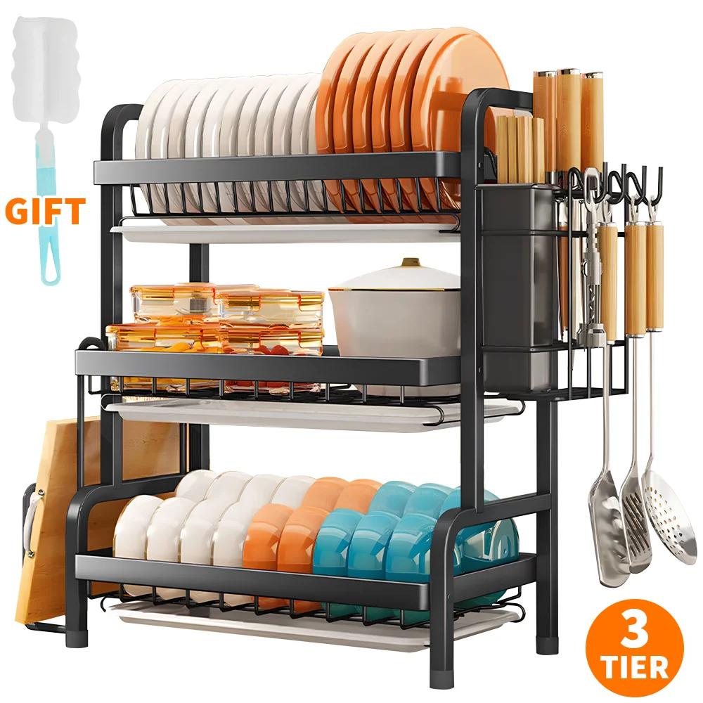 3-Tier Dish Drying Rack Dish Organizer Compact Kitchen Dish Rack Drainboard Set Dish Drainer with Utensil Holder
