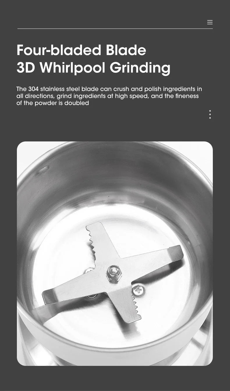 Scopri la freschezza del caffè appena macinato e la versatilità di un tritatutto professionale con questo macinacaffè elettrico multifunzione. Dotato di 4 lame in acciaio inox e capacità 300ml, macina caffè, spezie, cereali e molto altro in pochi secondi.