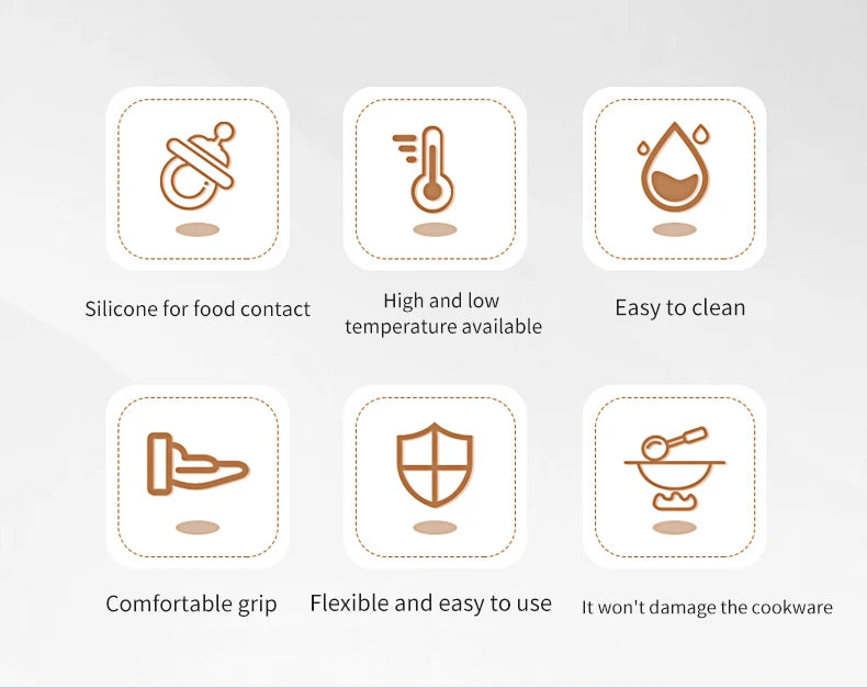 Equipaggia la tua cucina con questo set completo di 6 utensili in silicone di alta qualità. Include tutto ciò di cui hai bisogno per pasticceria, cottura e preparazioni quotidiane, con design innovativo a raschietto integrato.