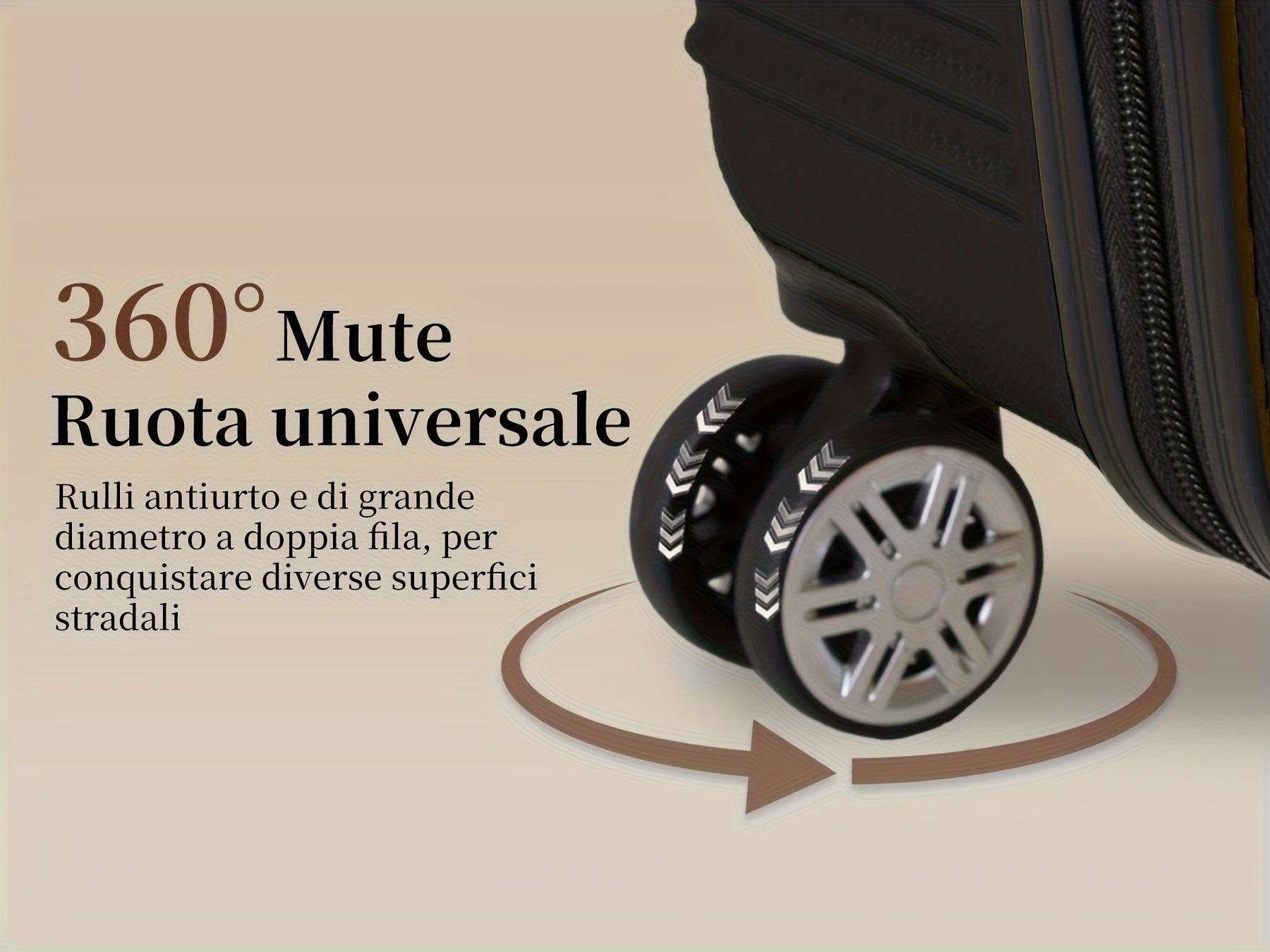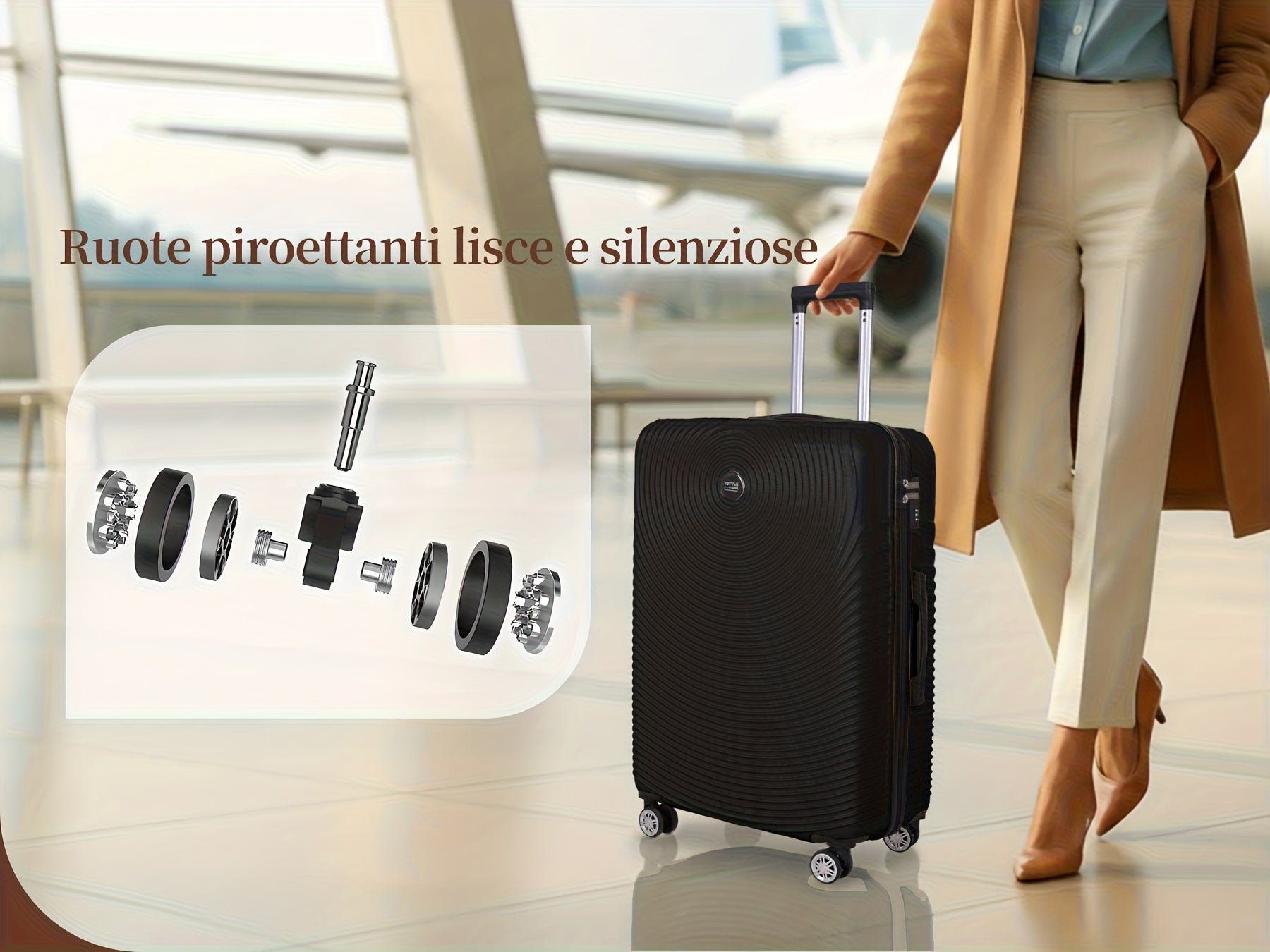 - Ruote silenziose a 360° - Massima manovrabilità e comfort anche negli aeroporti più affollati